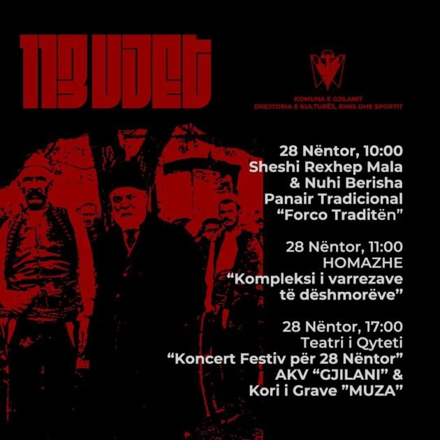 Sot, më 28 Nëntor 2025, qyteti i Gjilanit është mbushur me ngjyrat kuq e zi, muzikë dhe traditë, duke shënuar Festën e Flamurit dhe 113-vjetorin e Pavarësisë së Shqipërisë me aktivitete të veçanta të organizuara nga Komuna e Gjilanit.