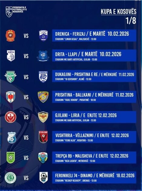 Mesjava sjell emocione të forta futbolli në Kupën e Kosovës. Federata e Futbollit e Kosovës ka publikuar orarin zyrtar të ndeshjeve të fazës së 1/8 së finales, ku skuadrat do të luftojnë për një vend në çerekfinale dhe për vazhdimësinë e ëndrrës drejt trofeut.