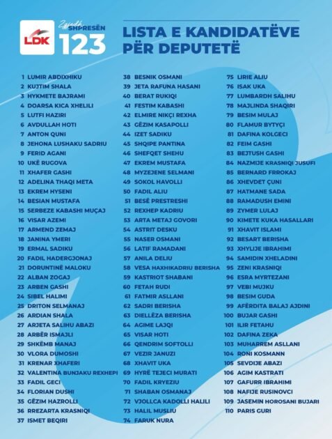 Kryetari i Lidhjes Demokratike të Kosovës (LDK), Lumir Abdixhiku, ka bërë publike listën e kandidatëve që do të garojnë për deputetë në zgjedhjet e ardhshme.